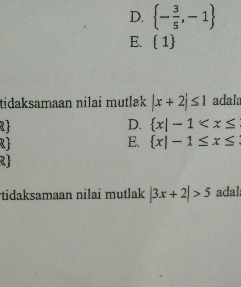 Tentukan himpunan penyelesaian pertidaksamaan ! Diperoleh atau kemudian faktorkan maka diperoleh: Dalam menyelesaikan pertidaksamaan nilai mutlak selain perlu mengetahui sifa sifat yang telah diberikan di atas kita juga perlu kemampuan untuk menguasai cara oprasi bentuk aljabar. Latihan 05 persamaan dan pertidaksamaan nilai mutlak 01. Seperti yang kita lihat, tanda mutlak bisa hilang jika dikuadratkan. Namun, pada artikel ini kita akan lebih fokus pada bentuk linier, baik dari kasus ataupun solusi, tanpa melibatkan bentuk kuadrat. Coba perhatikan bentuk selisih kuadrat berikut. Sistem persamaan linier dan kuadrat 08. Tentukan harga nol, yaitu nilai variabel yang menyebabkan nilai faktor sama dengan nol; Sehingga akan didapatkan hasil sebagai berikut. pertidaksamaan ini di antaranya pertidaksamaan linear, pertidaksamaan kuadrat, pertidaksamaan nilai mutlak, dan pertidaksamaan bentuk pecahan aljabar. Himpunan semua nilai pertidaksamaan merupakan himpunan penyelesaian (himpunan terselesaikan). Pengertian pertidaksamaan latihan 02 04.